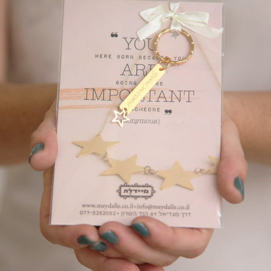 אריזה: מחזיק המפתחות מגיע ארוז על גבי גלויה מעוצבת קשור בסרט סאטן בשקית צלופן, מוכן כמתנה מפנקת.